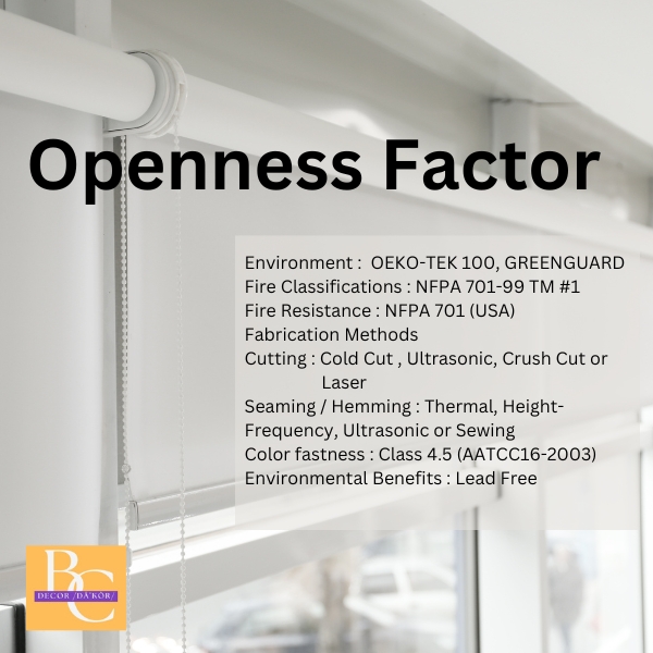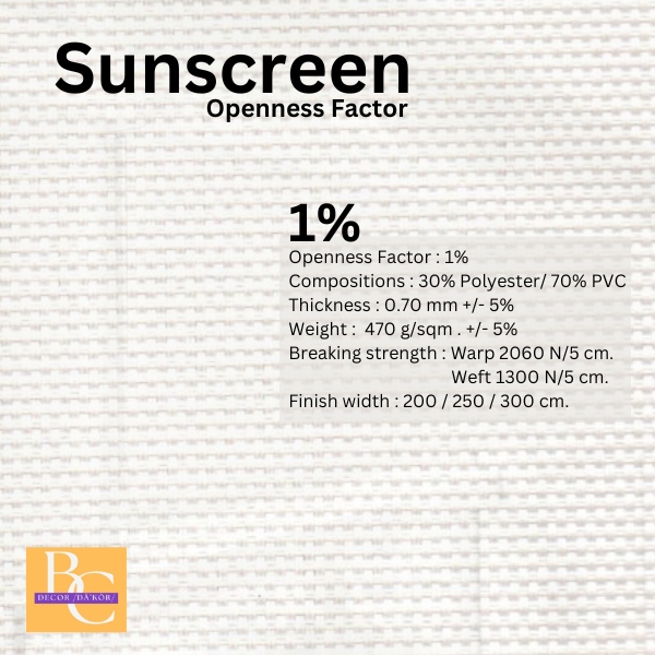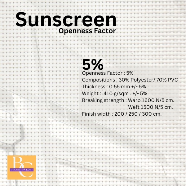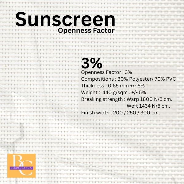 ปริมาณที่แสงผ่านได้ของผ้าซันสกรีน (Openness factor) ซึ่งเป็นผ้าที่นำมาผลิตเป็นม่านม้วน และม่านปรับแสงโดยระบุเป็นปริมาณที่แสงสามารถผ่านได้ในรูปแบบของเปอร์เซ็นต์ 1% 3% 5%