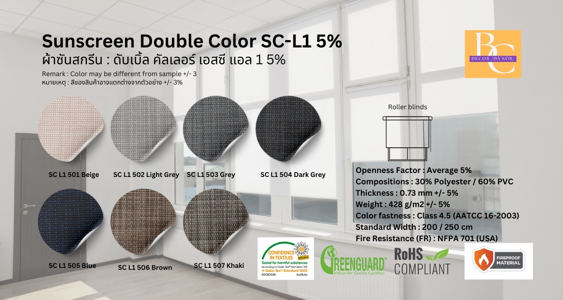 ผ้าซันสกรีนดับเบิ้ลคัลเลอร์ SC L1 5% ผ้าซันสกรีนดับเบิ้ลคัลเลอร์ SC L1 5% พร้อมผลิตม่านม้วน ในประเทศ สามารถสั่งตัดตามขนาดที่ต้องการ รองรับระบบโซ่วนเส้นเดียว และระบบอัตโนมัติ