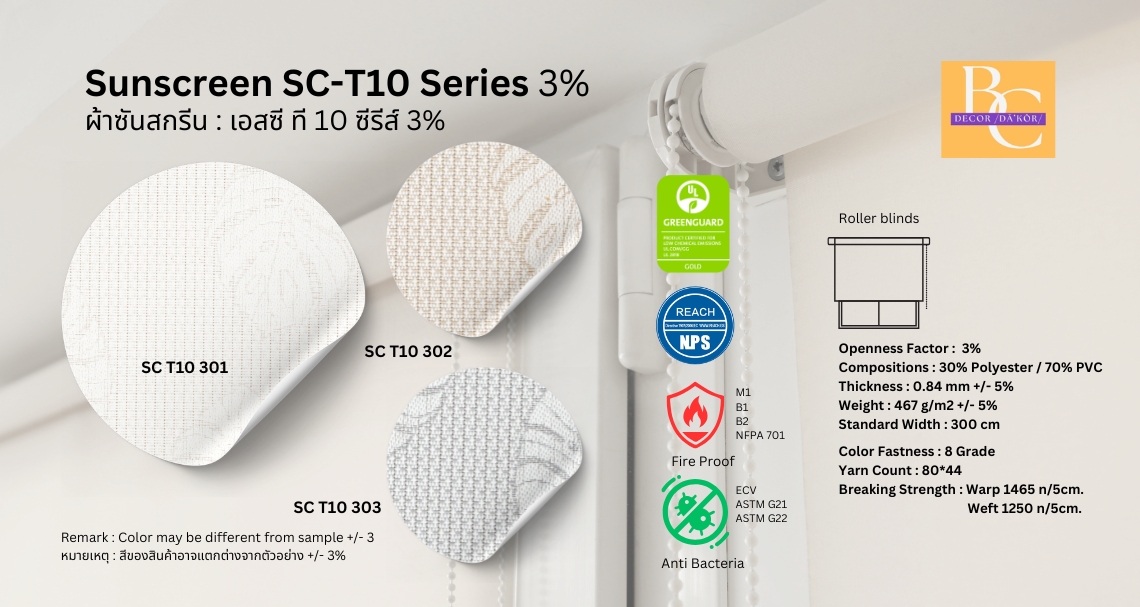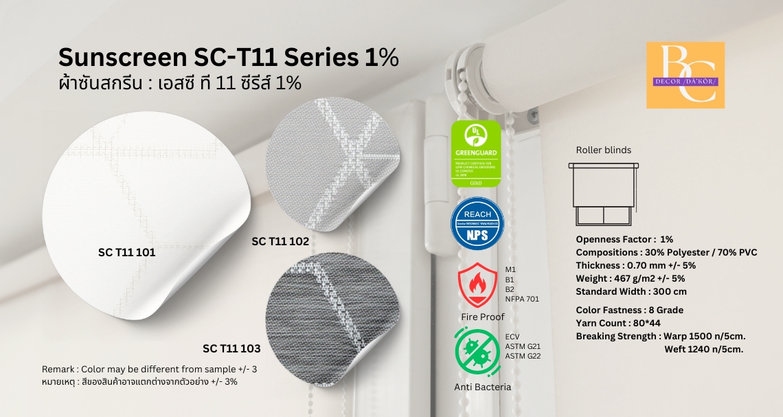 ผ้าซันสกรีน 3% 1% ผลิตม่านม้วนสั่งตัด SC T10 SC T11