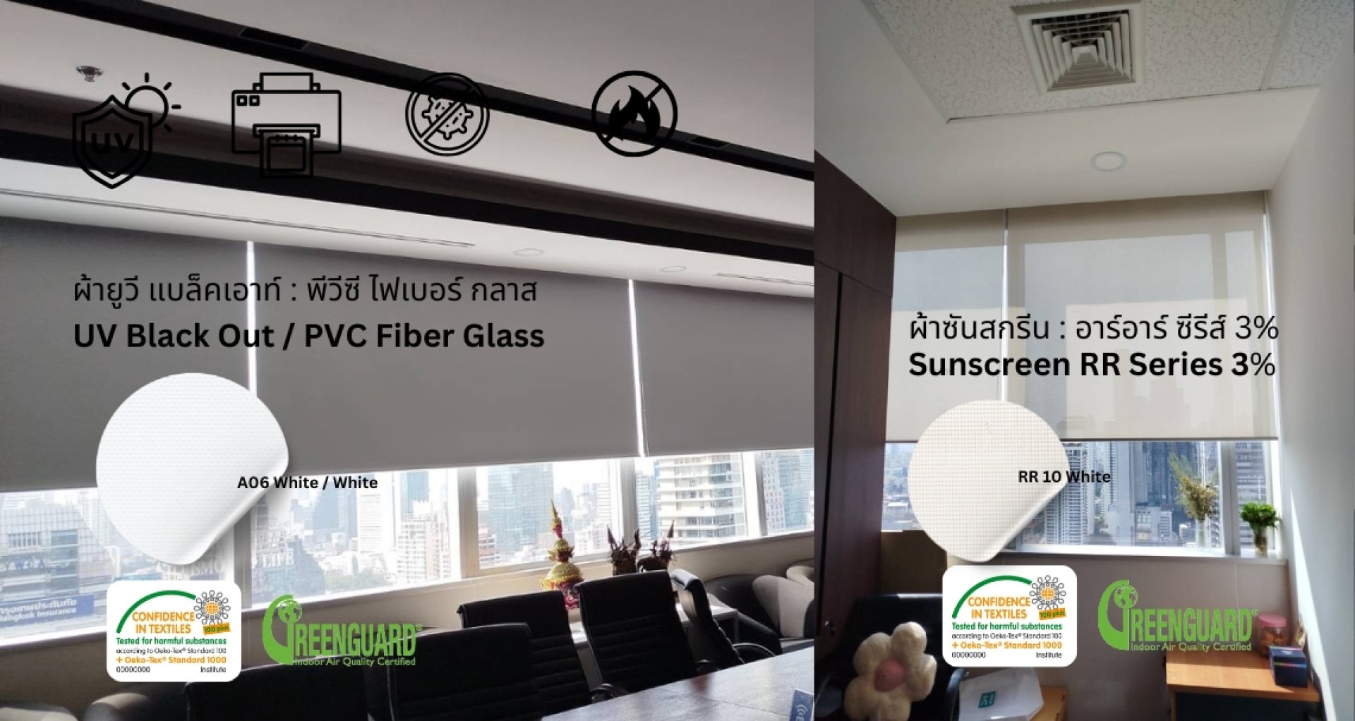 ตำแหน่งห้องทำงาน ติดตั้งม่านม้วน แสงสว่าง 3 % เพื่อกรองแสง